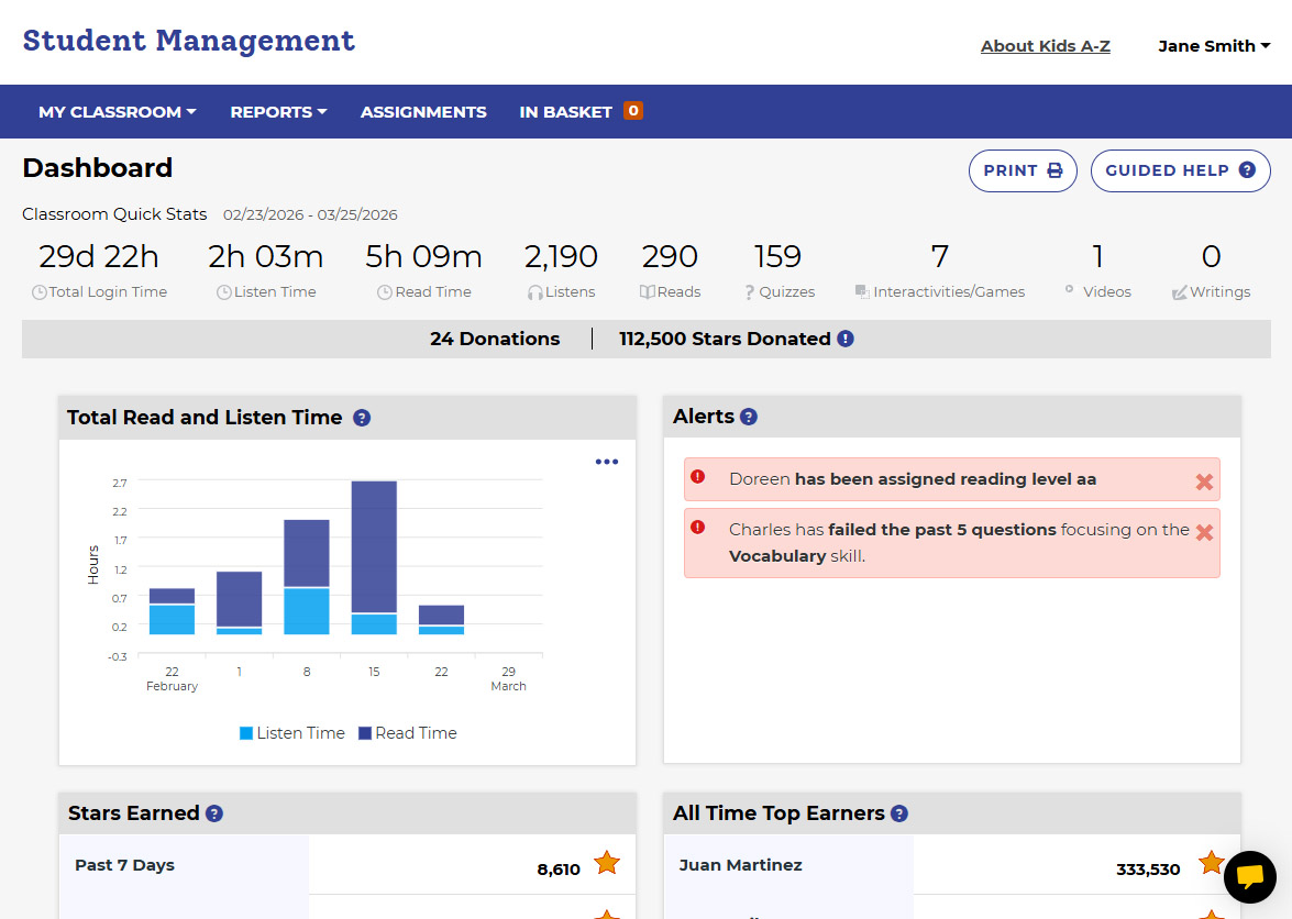 As the Learning A-Z product portfolio expanded into more student-facing offerings, the need for a unified student destination was rushing toward us. I conceived of Kids A-Z in 2014 as a single portal where any student could access every product their teacher owned. I led the design and build of the entire platform, student-facing and teacher-facing, guiding its evolution for over a decade. What started with 4 million students grew to 14 million. Ongoing user testing across age groups and grade levels drove continuous iteration.